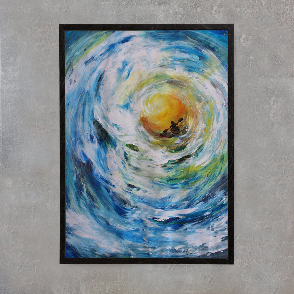 Картината изобразява пътуването към светлината – символ на надеждата и силата да следваш посоката си, дори сред вихрите на живота. Водата и небето се сливат в енергичен поток от движение, водещ към слънчевия център, който носи усещане за възраждане и вътрешна сила. „Пътят към светлината“ е картина за смелостта да продължиш напред.