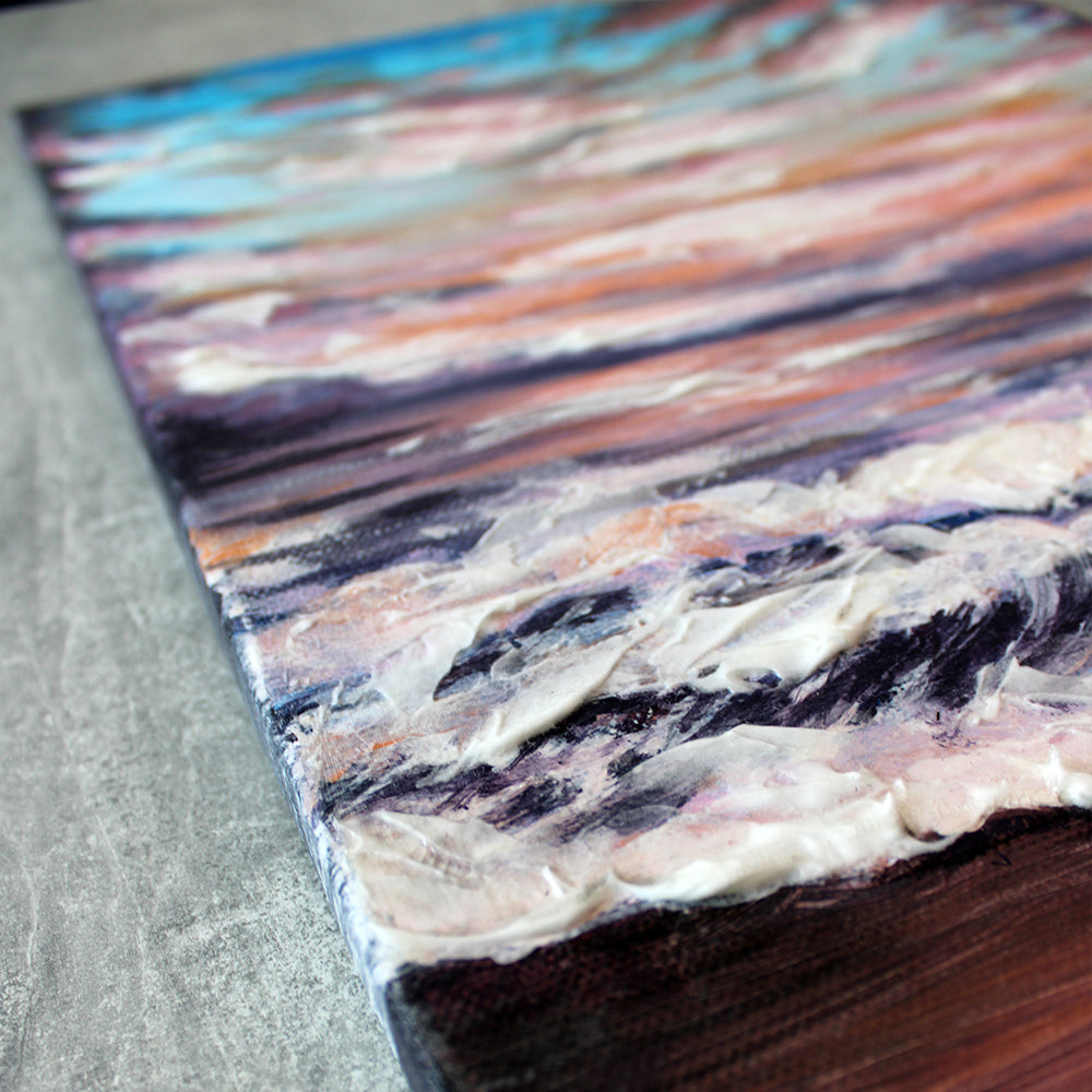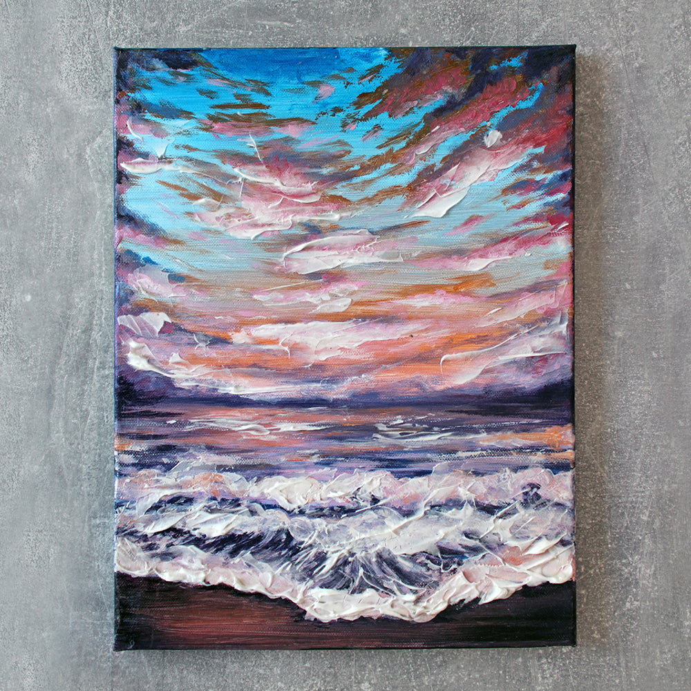 Картината носи спокойствието на морето в мигове на тишина. Вълните нежно докосват брега, а небето се обагря в меки розово-лилави и сини нюанси. „Тишината на вълните“ е пътуване към вътрешен мир – покана да се потопите в хармонията на природата и красотата на момента.